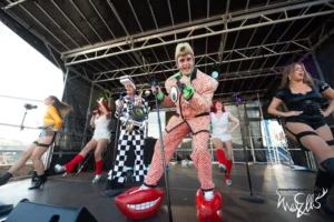 Circular collage featuring market scenes, street food stalls, live music, outdoor events, and a central Pride flag parade
